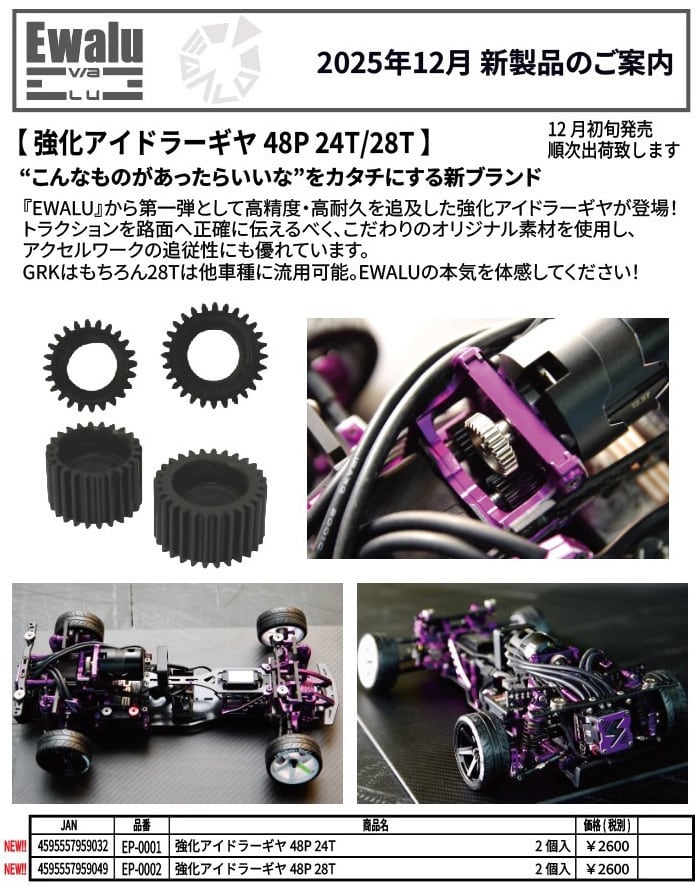 ”こんなものがあったらいいな”をカタチにする新ブランド『EWALU』からラジコン部門第一弾として高精度・超高耐久を追求した強化アイドラーギヤが登場!トラクションを路面へ正確に伝えるべく、こだわりのオリジナル素材を使用し、アクセルワークの追従性にも優れています。GRKはもちろん28Tは他車種に流用可能。EWALUの本気を体感してください!